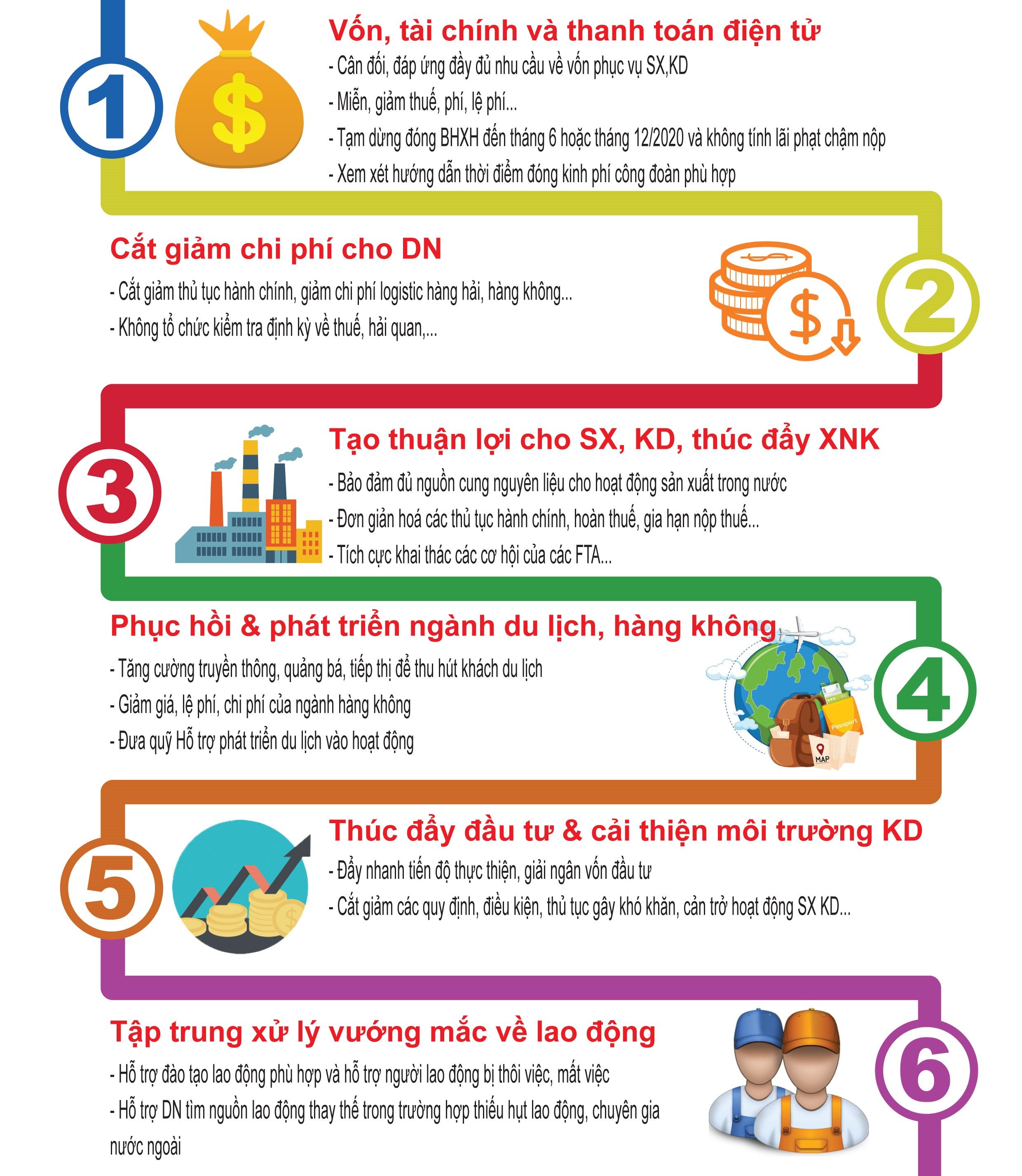 Được biết, Chỉ thị này sẽ đưa ra 6 nhóm giải pháp về: (1) vốn, tài chính và thúc đẩy thanh toán điện tử; (2) cắt giảm chi phí cho doanh nghiệp; (3) bảo đảm hoạt động sản xuất kinh doanh, thúc đẩy xuất nhập khẩu; (4) tháo gỡ khó khăn, phục hồi, phát triển ngành du lịch; (5) thúc đẩy đầu tư và giải ngân; (6) rà soát, xử lý vướng mắc về lao động, phương án hỗ trợ người lao động bị thôi việc, mất việc làm do ảnh hưởng của dịch COVID-19.