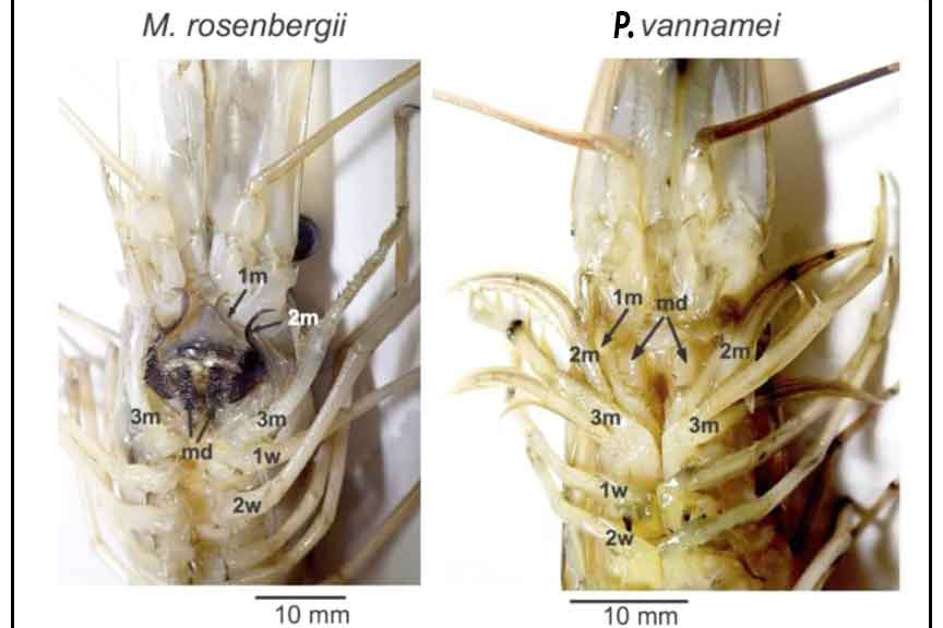 Năm 2018, Gunzo Kawamura và cộng sự đã nghiên cứu và đăng lên tạp chí Borneo Journal Sự so sánh hình thái và chức năng phần chân phụ của tôm thẻ chân trắng và tôm càng xanh. Nghiên cứu của Gunzo với 2 loài tôm dựa trên 3 loại thức ăn thủy sản là: thức ăn viên, mực miếng nhỏ và thịt cá.