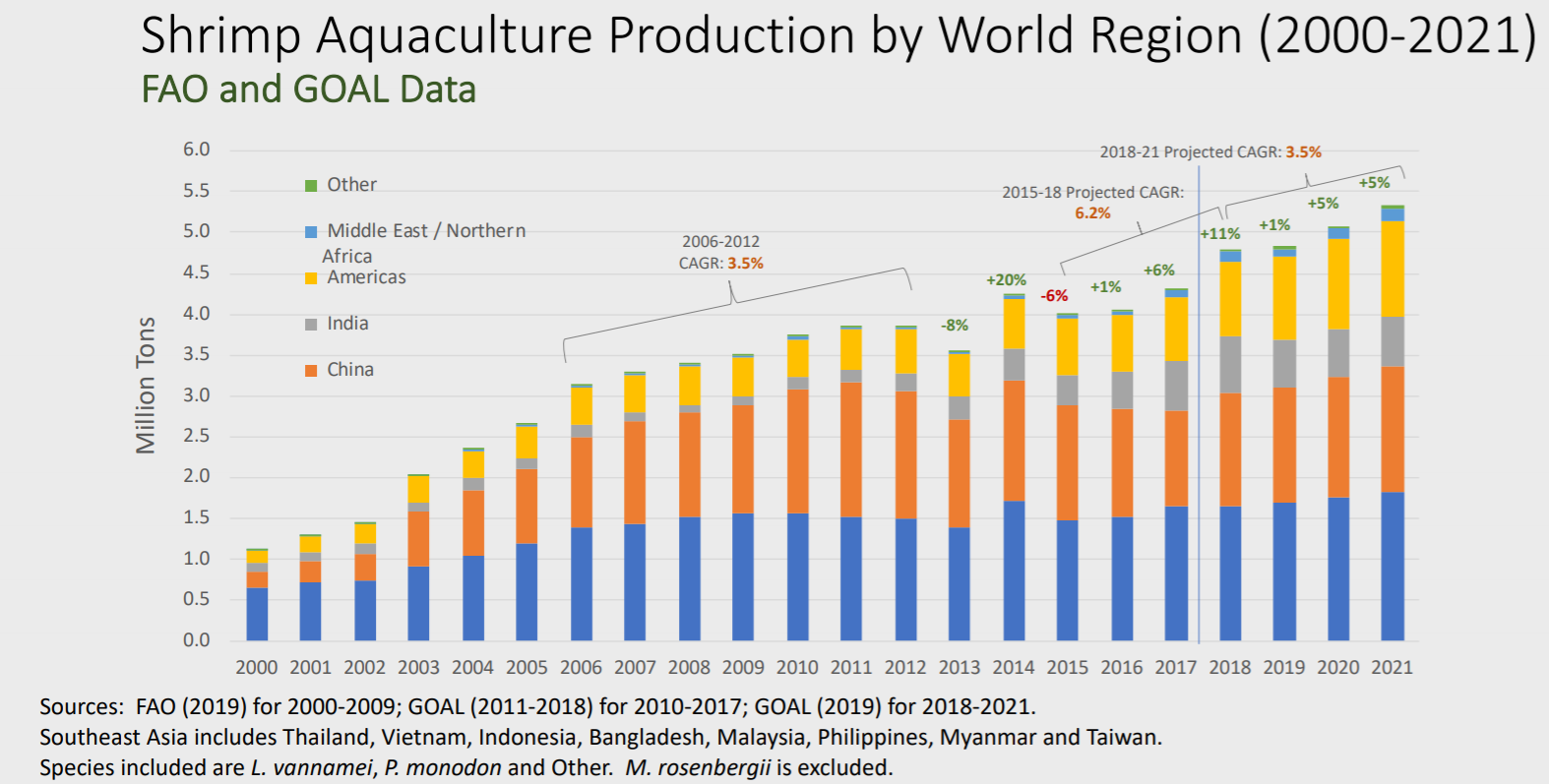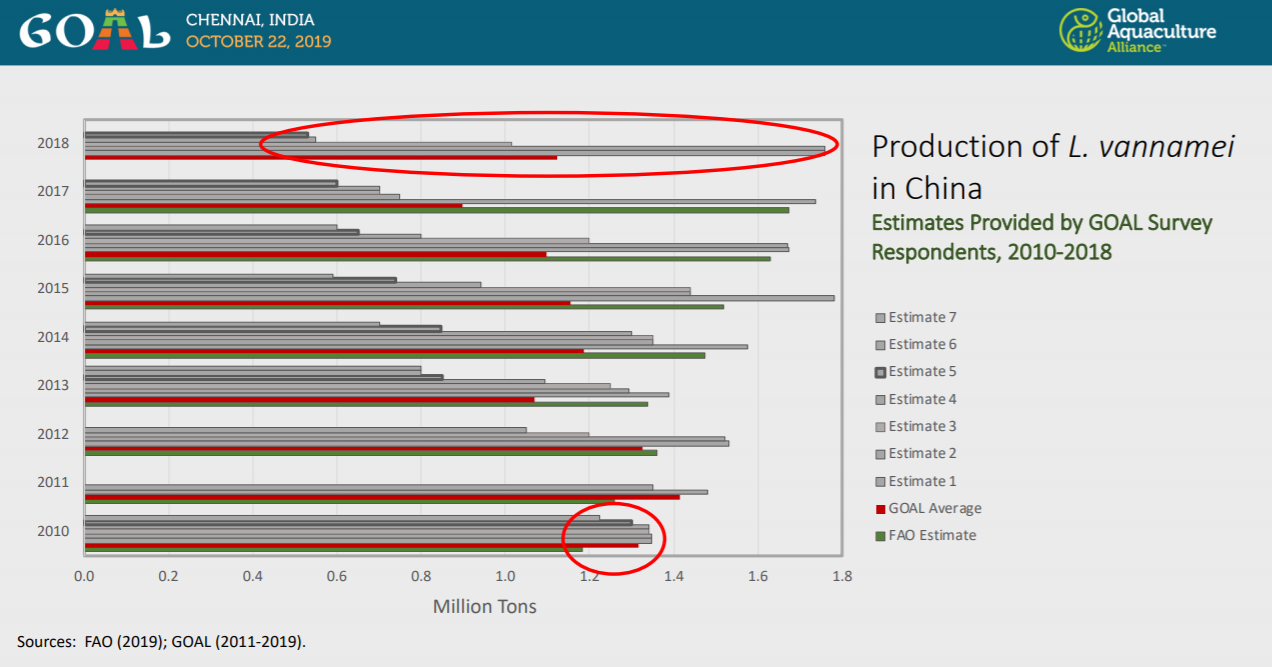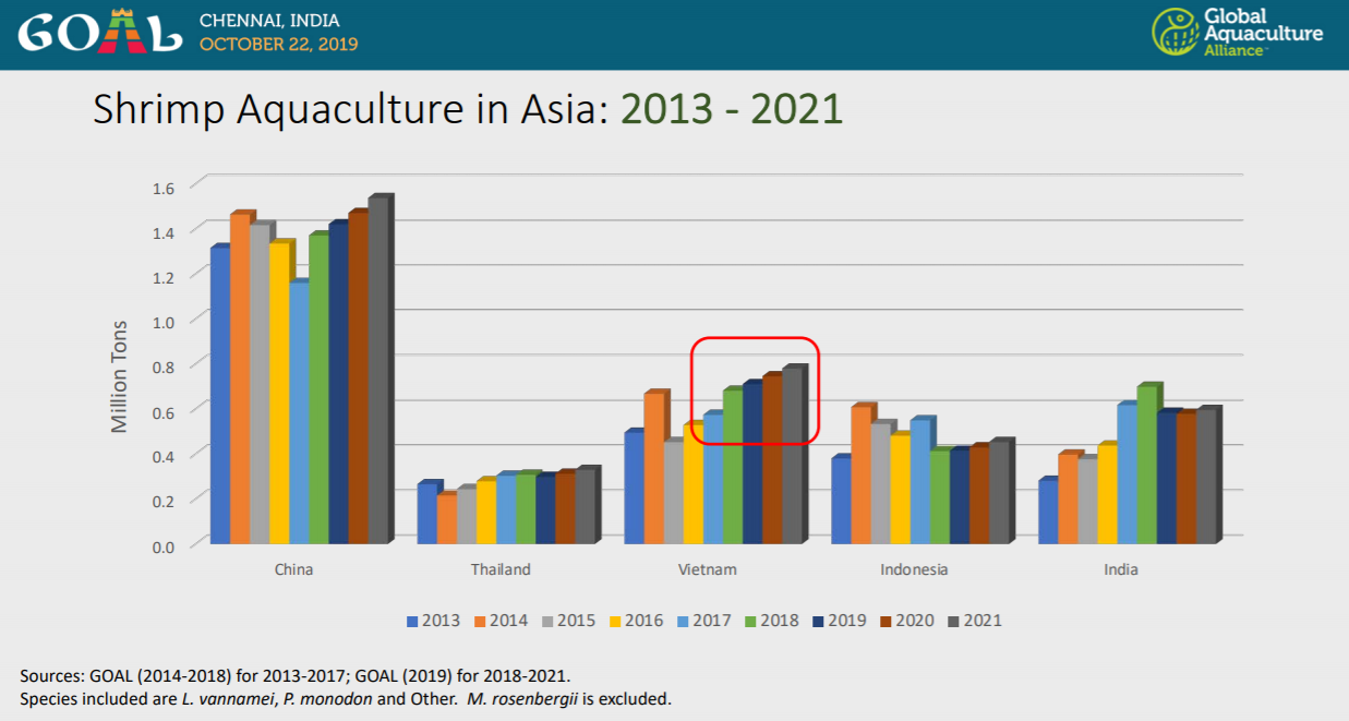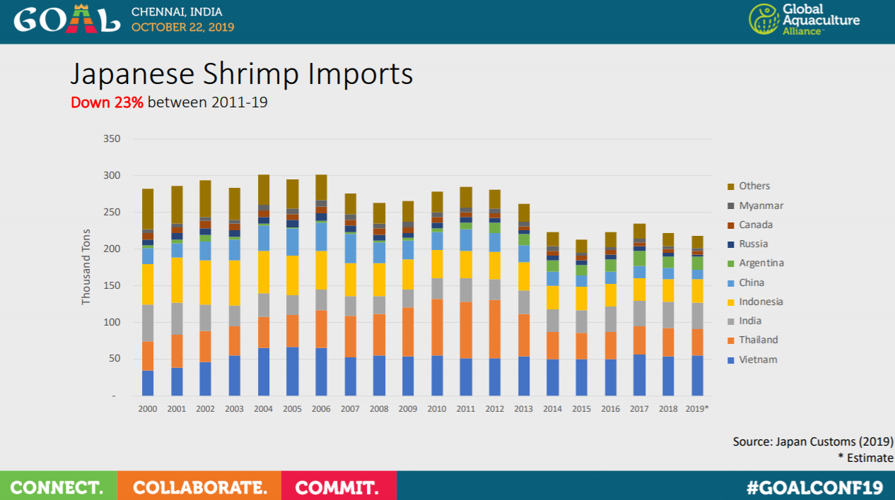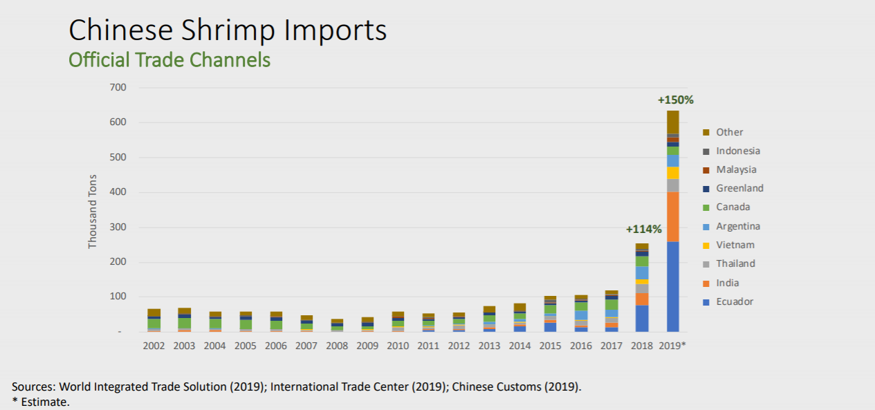 Dữ liệu bây giờ dường như cho thấy mức độ thực sự của nhập khẩu tôm Trung Quốc, bây giờ các tuyến đường "thương mại xám" chưa đăng ký đã được dập tắt. Nhập khẩu năm 2019 ước tính chỉ hơn 600.000 tấn, với các nhà cung cấp chính của Ecuador và Ấn Độ. Xuất khẩu đang giảm dần khi nước này tiêu thụ nhiều sản xuất của chính mình (hoặc khi sản xuất trong nước giảm).