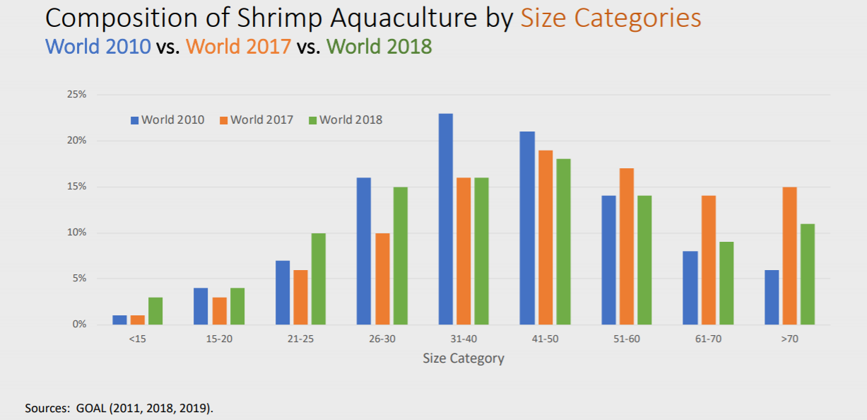 Anderson cũng trình bày dữ liệu về thành phần nuôi tôm theo kích cỡ. Điều này cho thấy tỷ lệ kích thước lớn nhất - 61-70 và trên 70 - đã giảm khá đáng kể giữa năm 2017 và 2018, được thu hoạch sớm hơn nhiều, đặc biệt là ở giai đoạn 21-25 và 26-30:
