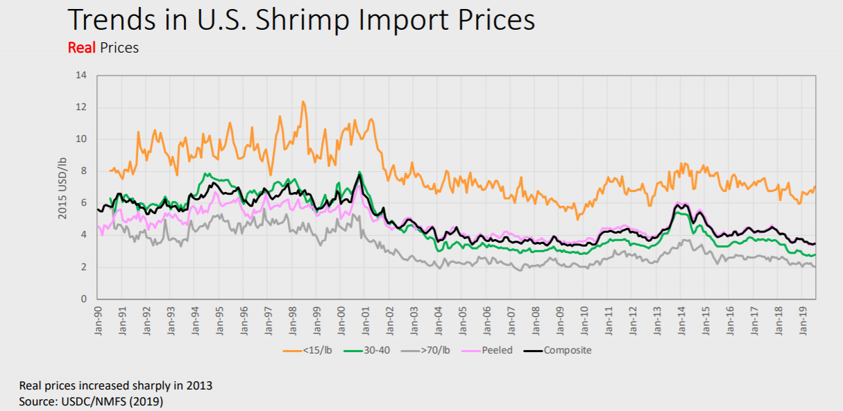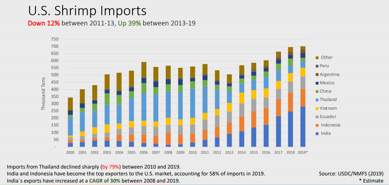 Về mặt thương mại, thị trường nhập khẩu tôm nuôi của Mỹ vẫn cao như trước đây, với Ấn Độ tiếp tục giành thị phần từ Thái Lan vào năm 2019 và những năm trước.