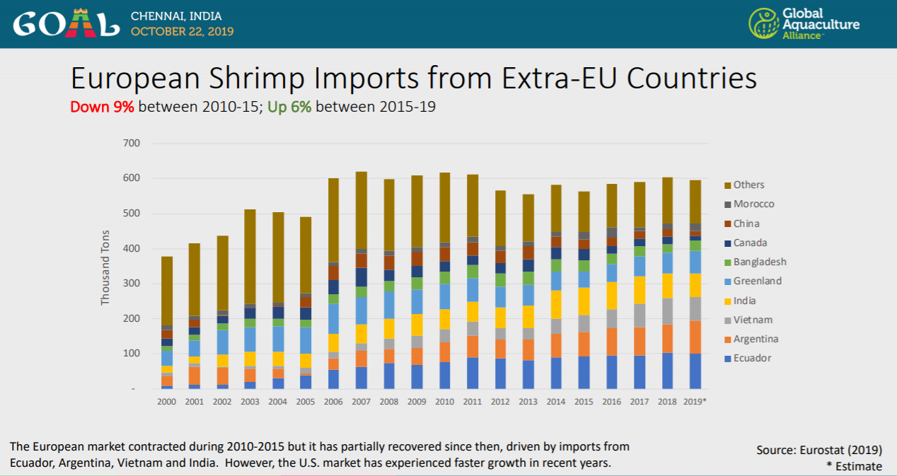 Thị trường nhập khẩu của EU từ các quốc gia ngoài EU được ước tính sẽ kết thúc năm 2019 giảm nhẹ so với cùng kỳ năm trước, có nghĩa là khối lượng tôm nhập khẩu đã tương đối tĩnh kể từ năm 2016.