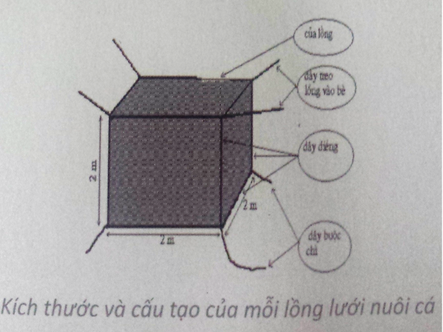 Lồng nuôi làm bằng lưới sợi ni-lông mắt lưới A10, sợi 210/9 có kích thước 2 x 2 x 2 m.