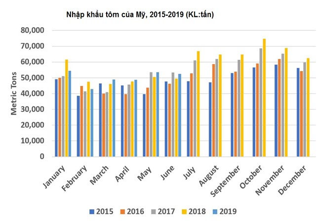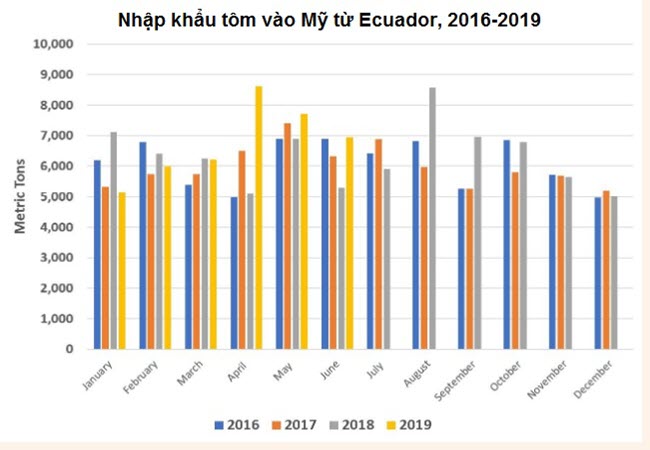 Mỹ nhập khẩu 6.950 tấn tôm, trị giá 48,3 triệu USD từ Ecuador trong tháng 6/2019, tăng 31% về khối lượng và 41% về giá trị so với cùng kỳ năm ngoái. Giá trung bình nhập khẩu đạt 6,93 USD/kg trong tháng 6/201.