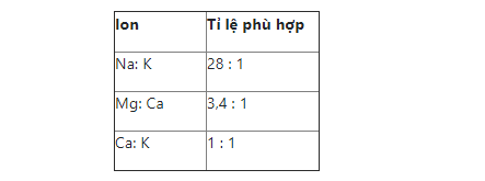 Chú thích: Cột 1 là hàm lượng ion khoáng tiêu chuẩn ở nước có độ mặn 35ppt. Cột 2 là cấp số nhân.
