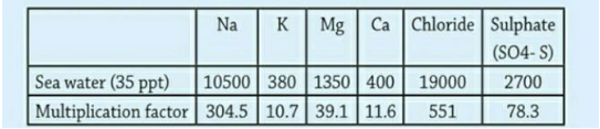 Nồng độ ion khoáng trong ao có độ mặn thấp phải được tăng lên để tương ứng với nồng độ của chúng trong nước biển pha loãng cùng độ mặn. Để có được lượng khoáng chất mong muốn ở các độ mặn khác nhau, độ mặn nước (theo ppt) được nhân với các yếu tố cho từng khoáng chất.